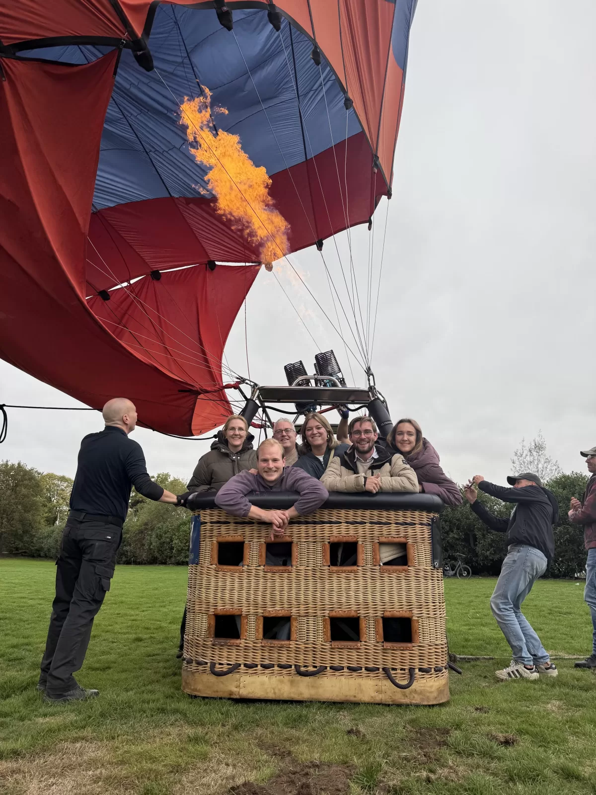 Voor de vaart kregen alle passagiers een drankje naar keuze. Daarna verzamelde Bram iedereen voor de voorbereidingen. Met een grote ventilator werd de ballon gevuld met lucht, waarbij ook passagiers mee mochten helpen door de ballon open te houden. Zodra de ballon genoeg vorm had, zette Bram de branders aan en langzaam richtte de mand zich op. Toen was het moment daar: instappen en opstijgen.